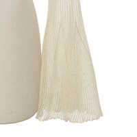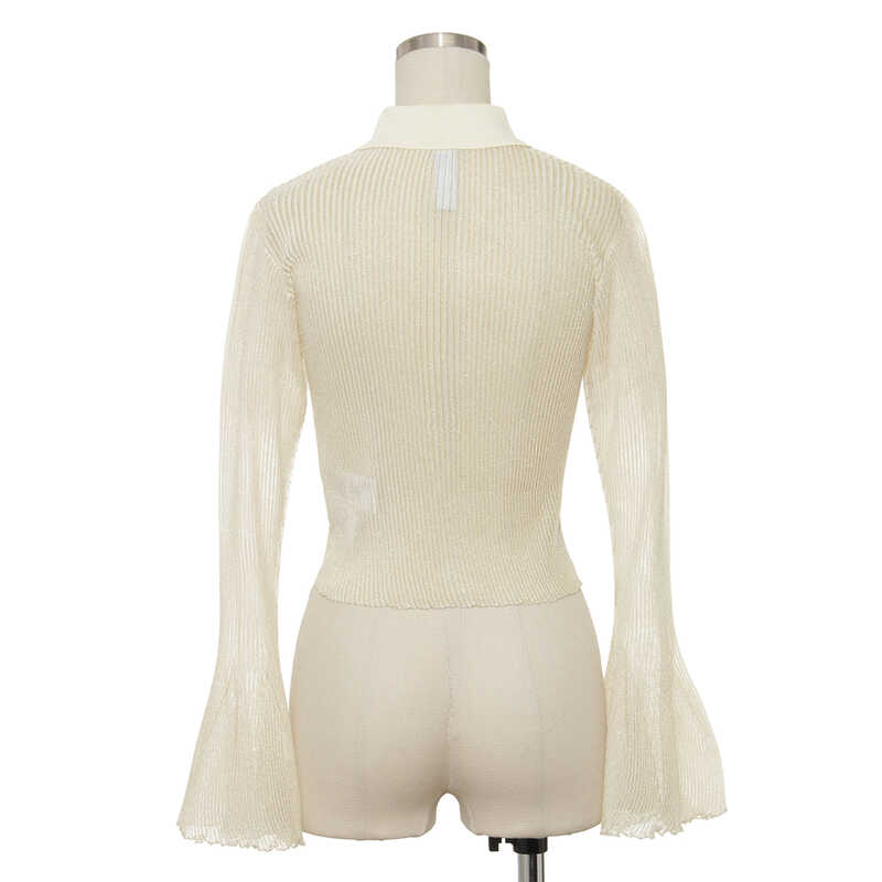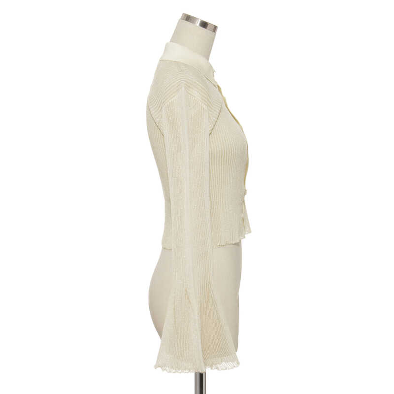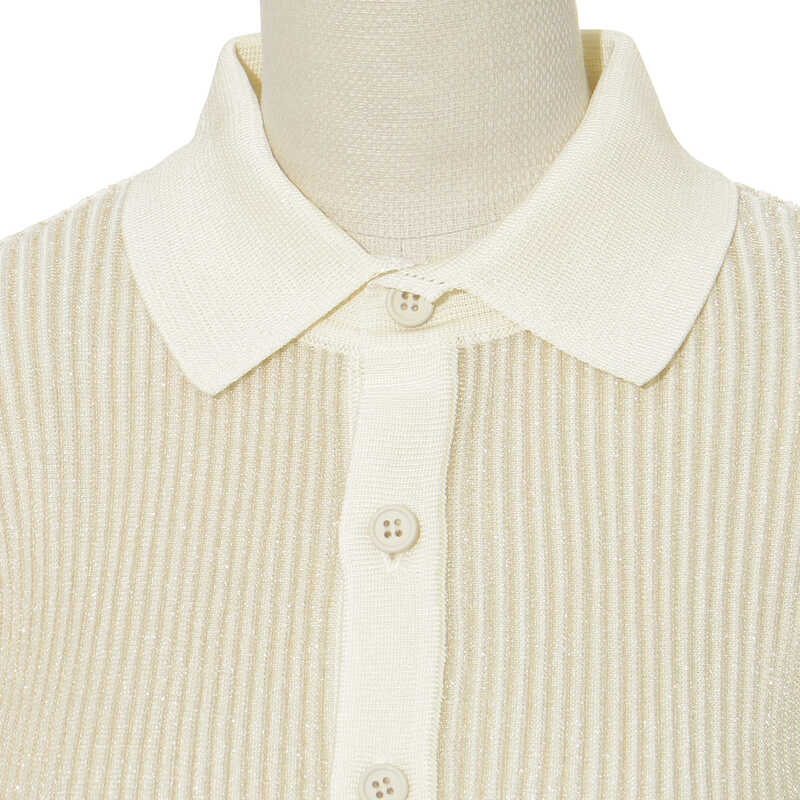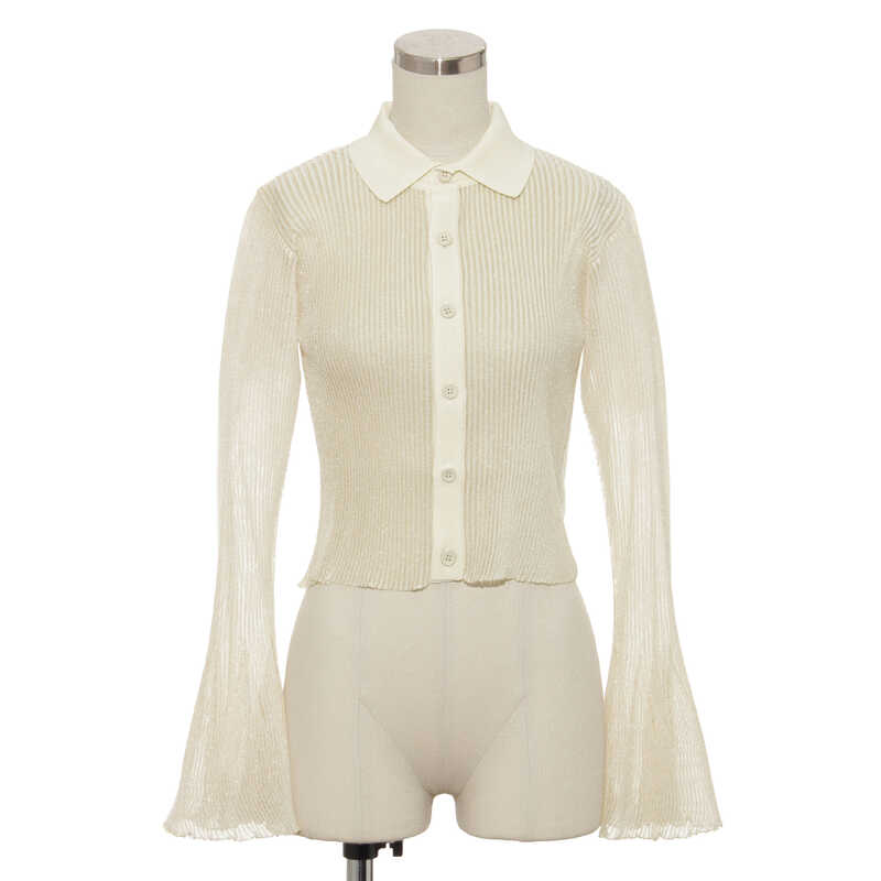 部分的に透け感のある糸と繊細なラメ糸を用いたシャツカーディガン。タックによって作られたフレアが袖口に向かって滑らかに広がります。ピンタックを思わせる立体的なストライプ状の編み地は、見る角度によって異なる印象を与えます。