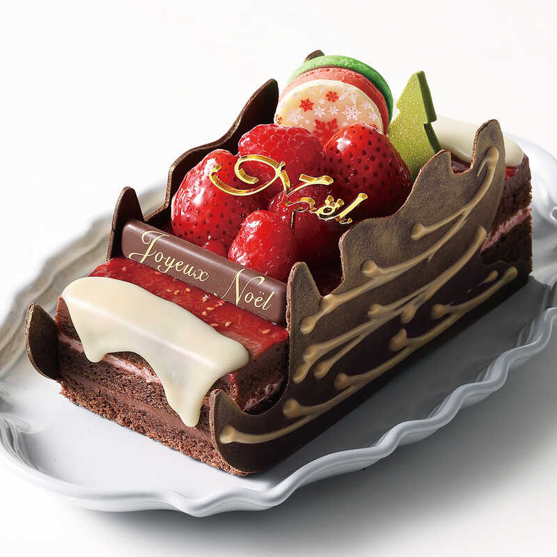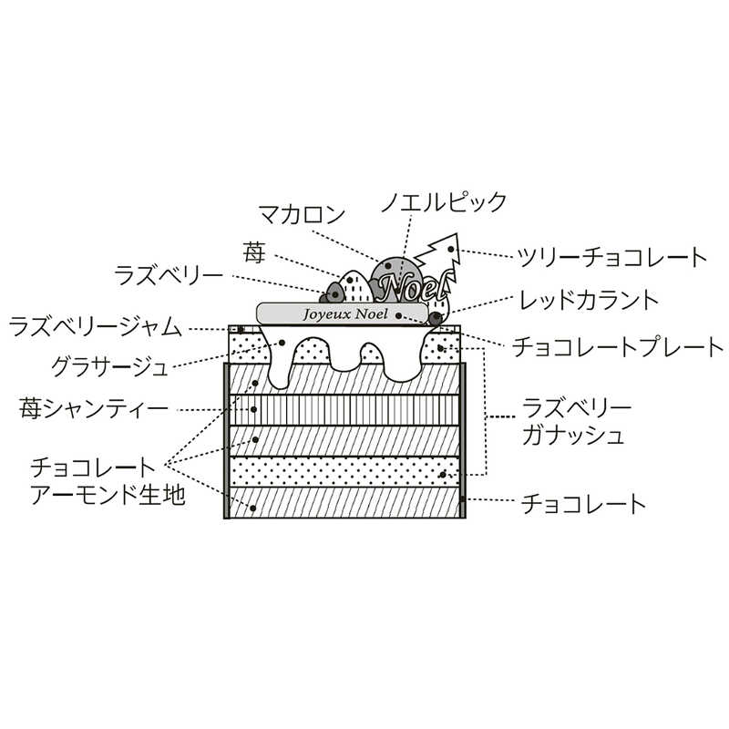 チョコレートアーモンド生地をメインに、ラズベリージャム、いちごシャンティー、ラズベリーガナッシュを組み合わせた4層仕立ての贅沢な一品。ラズベリーや苺の甘酸っぱさやチョコレート生地のふわふわ食感など様々な味や食感を楽しめる、サンタクロースのそりをイメージした見た目にも楽しいケーキです。