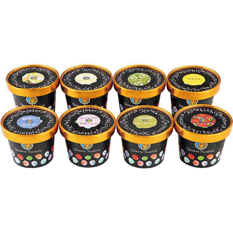 - 朝搾りミルク・はつもみぢの酒粕ミルク・河村玉煎堂のほうじ茶ミルク・山口県産いちごミルク・周防大島みかんソルベ・ゆずきちソルベ・夏みかんソルベ・阿武町産キウイソルベ(各121mL)×各1