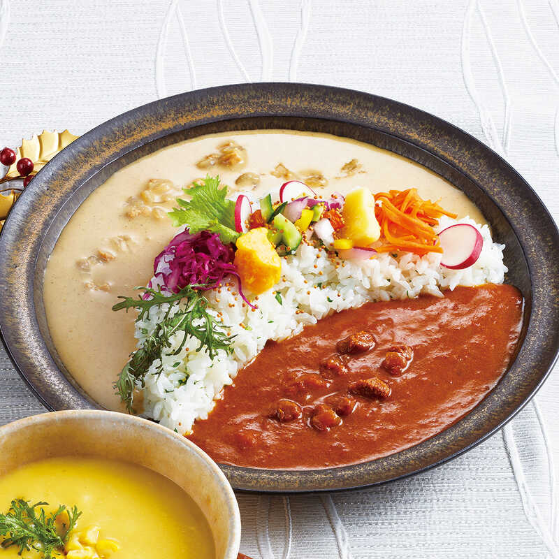 紅白のカレーは「あいがけ」がおすすめ。1箱に2種類が入ったよくばりカレー。トマトの赤い中辛ビーフカレーと、クリームチーズのまろやかな白のチキンカレー。
