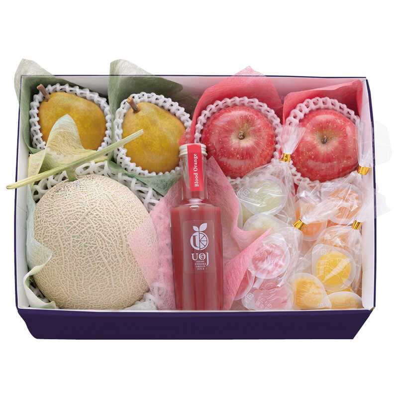 熊本または宮崎または長崎県産マスクメロン(1.2kg)×1、青森または岩手または長野県産サンふじりんご×2(計500g)、山形または青森県産ラ フランス×2(計500g)、愛媛県産ブラッドオレンジジュース(150mL)×1、果汁入り一口ゼリー/長野産シャインマスカット・瀬戸内レモン・北海道産夕張メロン・福岡産あまおう×各3