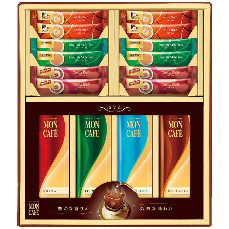モンカフェドリップコーヒー/コロンビアブレンド・モカブレンド・キリマンジャロブレンド・コスタリカブレンド×各3、スティック/匠のカフェオレ ミルクリッチ・バンホーテン ココアリッチ・トワイニング イングリッシュミルクティー×各4