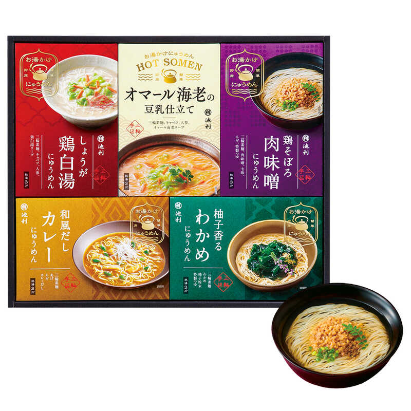 - 柚子香るわかめ・和風だしカレー・鶏そぼろ肉味噌・オマール海老・しょうが鶏白湯×各1(各めん45g・具材)