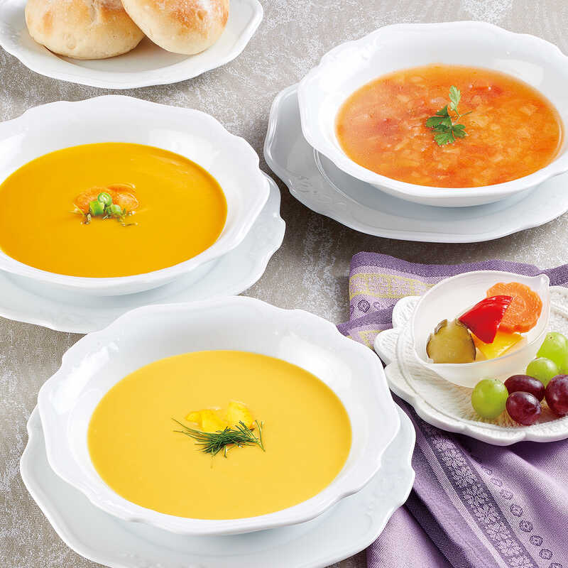 それぞれの野菜のうまみを引き出した4種のスープ。〈帝国ホテル〉の味をご家庭でどうぞ。