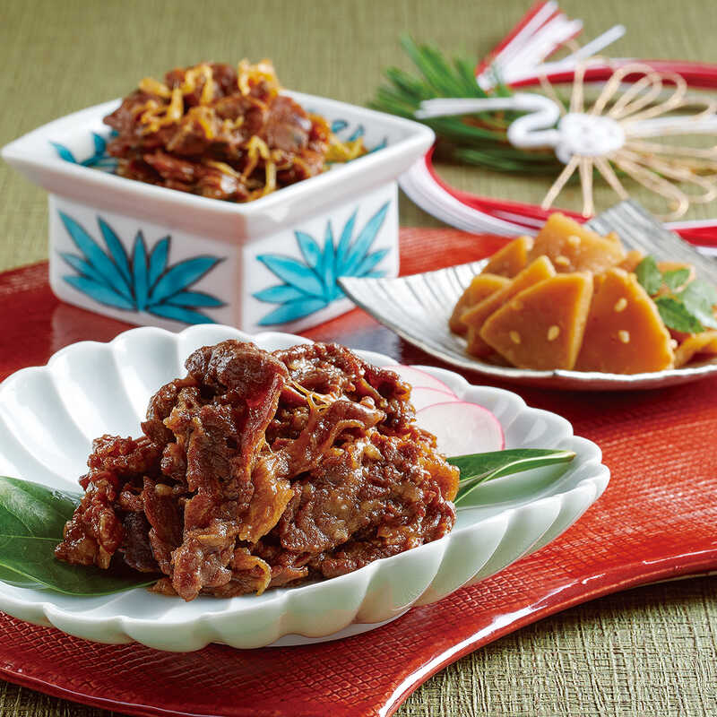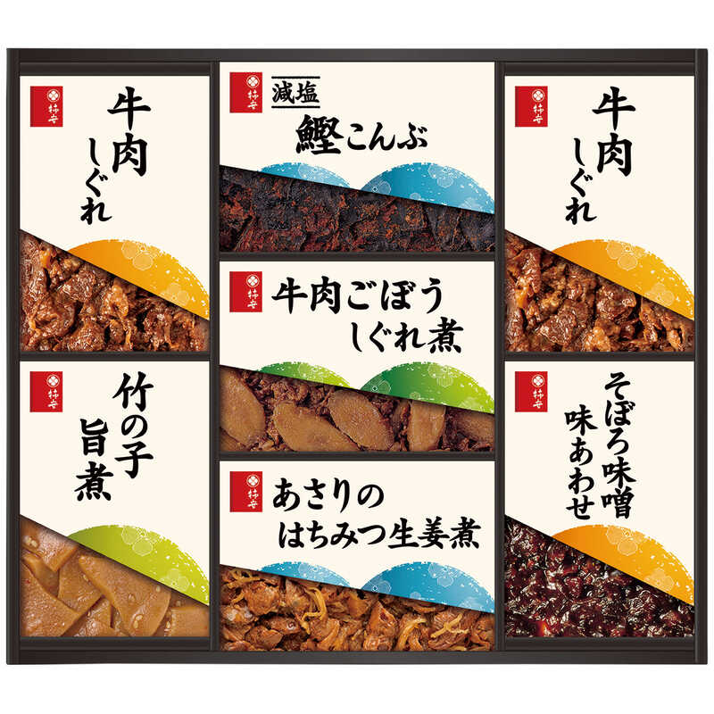 - 牛肉しぐれ(50g)×2、牛肉ごぼうしぐれ煮・減塩鰹こんぶ・竹の子旨煮(各50g)・あさりのはちみつ生姜煮(40g)・そぼろ味噌味あわせ(90g)×各1