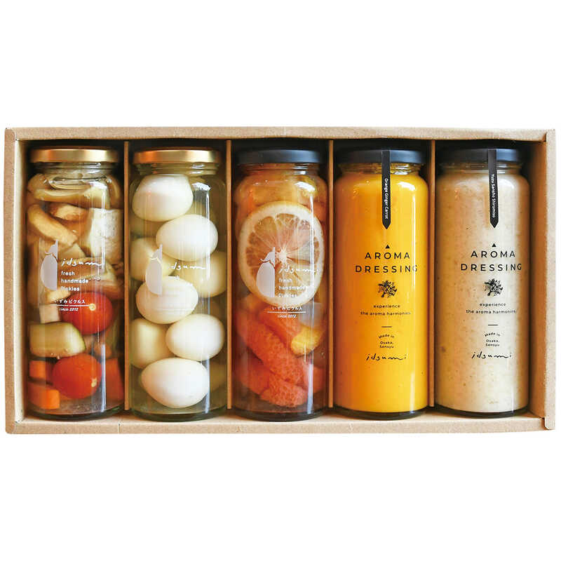 水なすピクルス和風(210g)・うずら卵のピクルス(ピュアモルトフレーバー)(220g)・6種のフルーツコンポート(210g)・アロマドレッシング(オレンジ&ジンジャー&にんじん)・アロマドレッシング(ゆず&山椒&白みそ)(各200mL)×各1