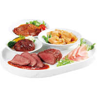 ローストビーフグレイビージュレ仕立て(180g)・生ハムロース(45g)・豚肉のしょうが煮(130g)×各1、デミグラスソースハンバーグ(120g)・豚ロースの醤油煮込み(70g)×各2