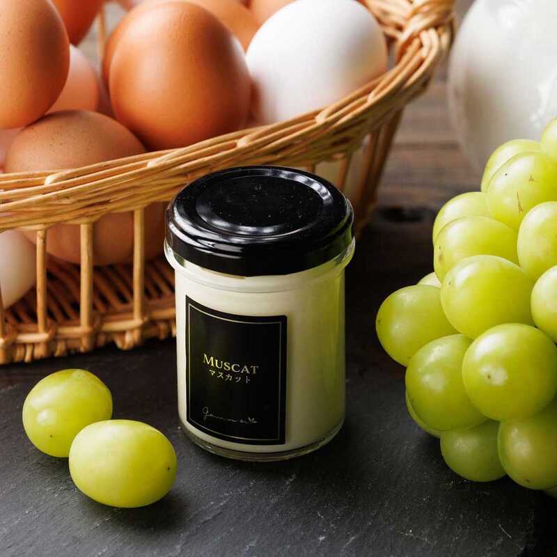 【おかやま白桃】岡山産「白桃」がたっぷり入ったまるで桃を食べているようなジューシーなプリン。平成30年 ”食のプロが集まる、アジア最大級の食の展示会「FOODEX JAPAN2018」にて行われた「ご当地スイーツグランプリ」において「金賞」と「ご当地審査員賞」を受賞。【マスカット】岡山産「アレクサンドリアマスカット」を使用した果汁たっぷりの瑞々しいプリン。【ピオーネ】岡山県産のピオーネをたっぷり使用したプリンは、ピオーネと濃厚ミルクとの相性が絶妙なプリン。