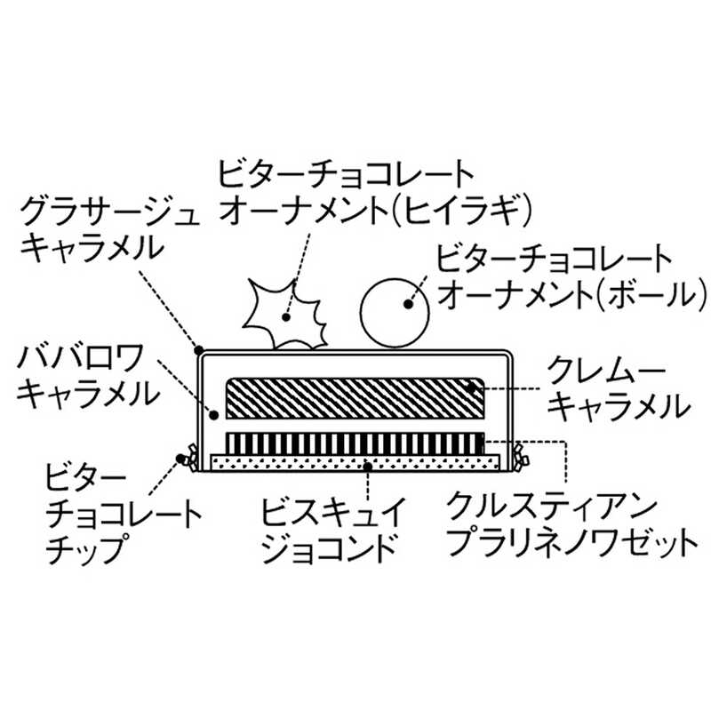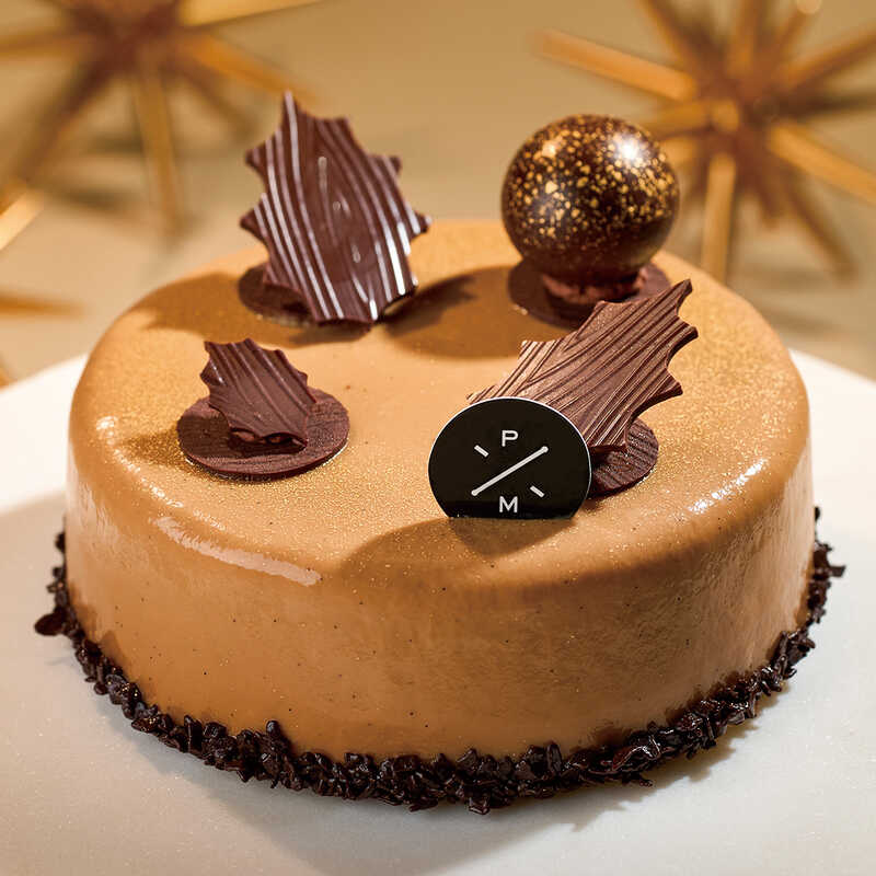 くちどけ滑らかなババロワ キャラメルと濃厚なクレムー キャラメルを重ねて仕立てたクリスマス限定のキャラメルケーキ。深いキャラメルの味わいに、香ばしいヘーゼルナッツの風味とサクサクとした歯応えがバランスよく調和しています。艶やかなグラサージュの上には、オリジナルビターチョコレートで作ったボールとヒイラギを飾りました。聖なる夜をシックに彩る、ピエール マルコリーニならではのクリスマスケーキです。