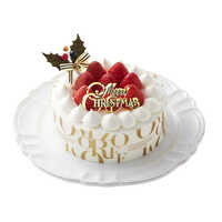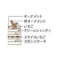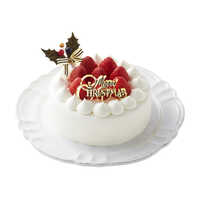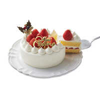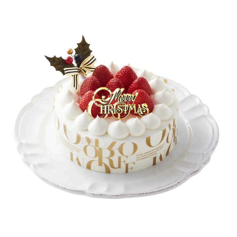 ふんわり口どけがよくたまごの味わいが豊かなスポンジケーキで、スライスしたいちごとたっぷりのクリームシャンティをサンド。天面にはいちごを8粒トッピングし、柊オーナメントと金色の「メリークリスマス」オーナメントが華やかにケーキを飾ります