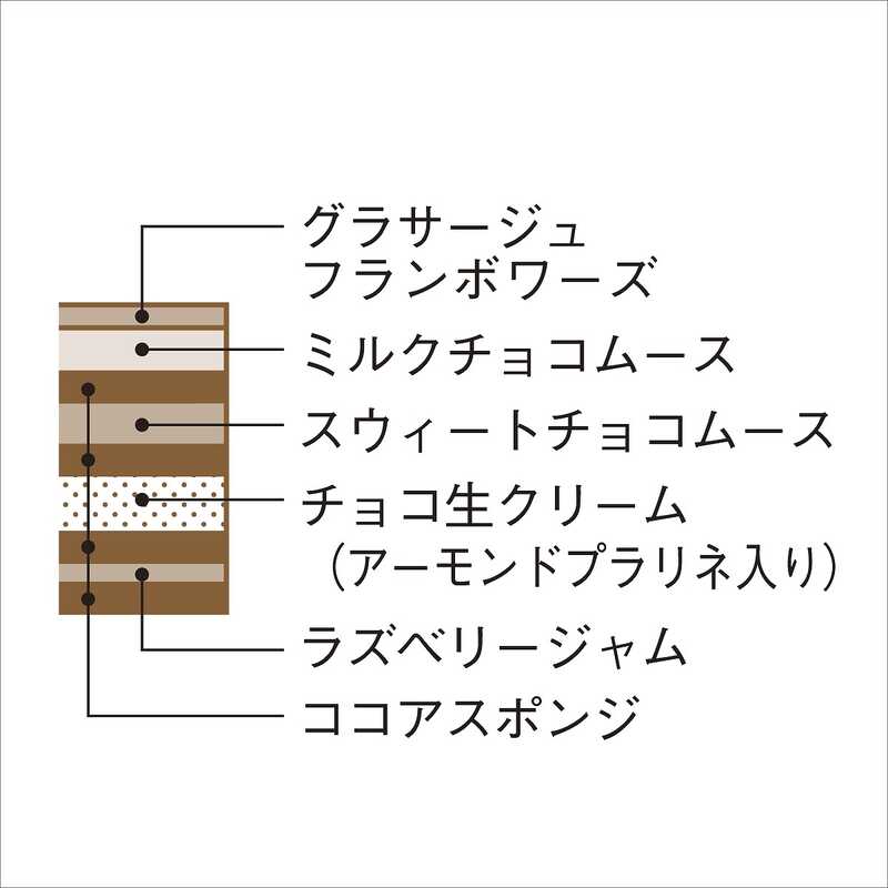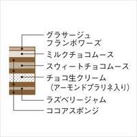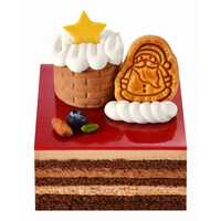 チョコレートムースやチョコレートクリーム、甘酸っぱいラズベリーのグラサージュを重ねた土台に、煙突に見立てたロールケーキとサンタクロースのビスケットを乗せ、赤い屋根の上を表現しました。クリスマスの楽しい夜をイメージした遊び心あふれるケーキです。