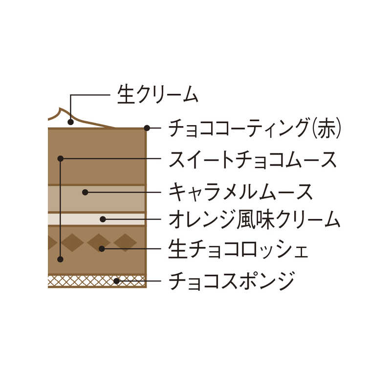 濃厚なチョコレートムースに当店で大人気の生チョコレート、博多ロッシュをアクセントに加えた特別な日に相応しいチョコレートケーキです。
