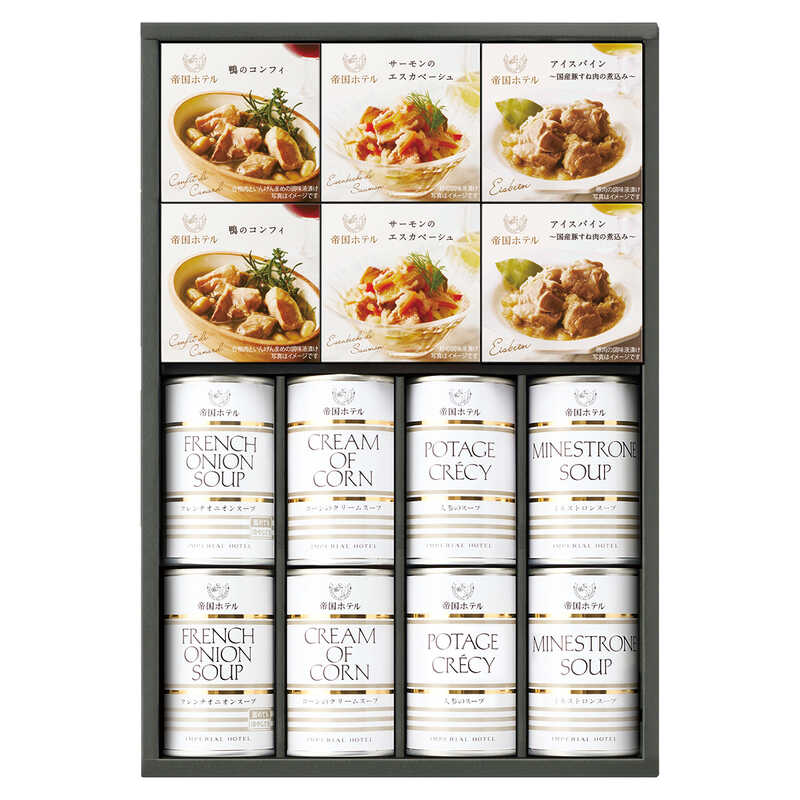 - コーンのクリームスープ・フレンチオニオンスープ・ポタージュクレシー(人参のスープ)・ミネストロンスープ(各160g)×各2、サーモンのエスカベーシュ・アイスバイン(国産豚すね肉の煮込み)・鴨のコンフィ(各85g)×各2