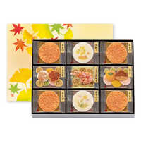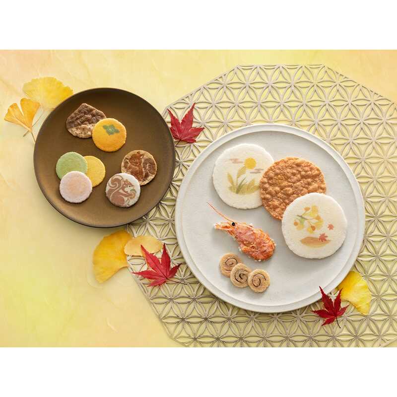 定番の「姿焼き」や「炙り焼き」と日本の秋の情景を描いたえびせんべいの詰合せです。