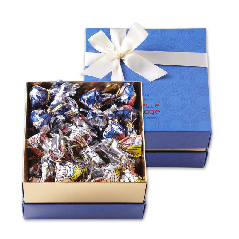 カカオ豆型のチョコレートを7粒、アフリカの伝統的な一枚布・パーニュをイメージしたカラフルなフィルムで包みました。1つの包みで3つの風味をお楽しみいただけます。