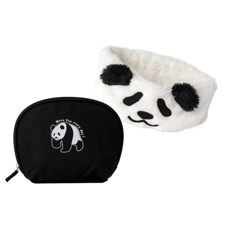 てくてく歩くパンダのワンポイントデザインが愛らしい、シンプルなシェル型ポーチは、マチ付きで収納力抜群。またファスナー部分も大きく開き、中身が見やすく取り出しやすいので、普段使いや旅行にオススメです。パンダのお顔が大きくデザインされた、ほわほわの優しい素材感のヘアバンド締め付け感の少ないゴムで、ふんわりとは、した肌触りに癒されます♪洗顔やメイク時をはじめ、おうちでのリラックスタイムにもぴったりです。