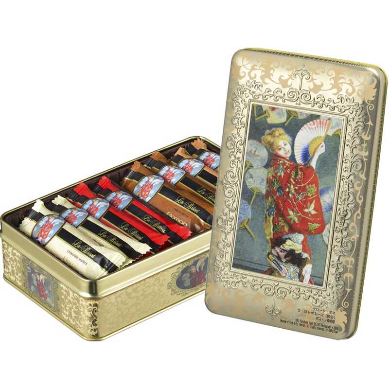 レーマンが誇る50年以上のロングセラー商品。チョコレートやチョコレートと生地を組合せたチョコレート菓子4種類のアソートです。クロード・モネ『ラ・ジャポネーズ(部分)』の期間限定デザインです。