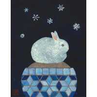 兎も猫のように香箱座りをすると聞きました。クリスマスオーナメントやモザイクタイルをイメージして描いた器と、盆栽のような丘を描きました。本当のタイルがはってあるかのように、技法を用いて凹凸を出しています。岩絵具も使用しているのでキラキラしています。今作品は青色をイメージたので、青色の目の白兎を描きました。