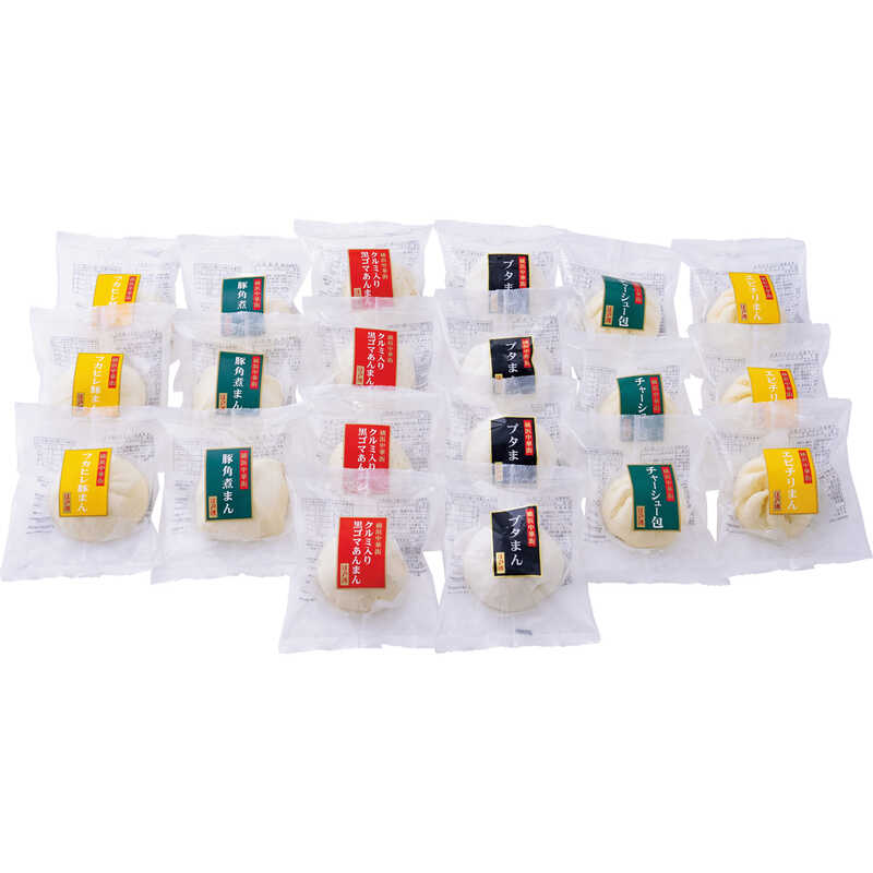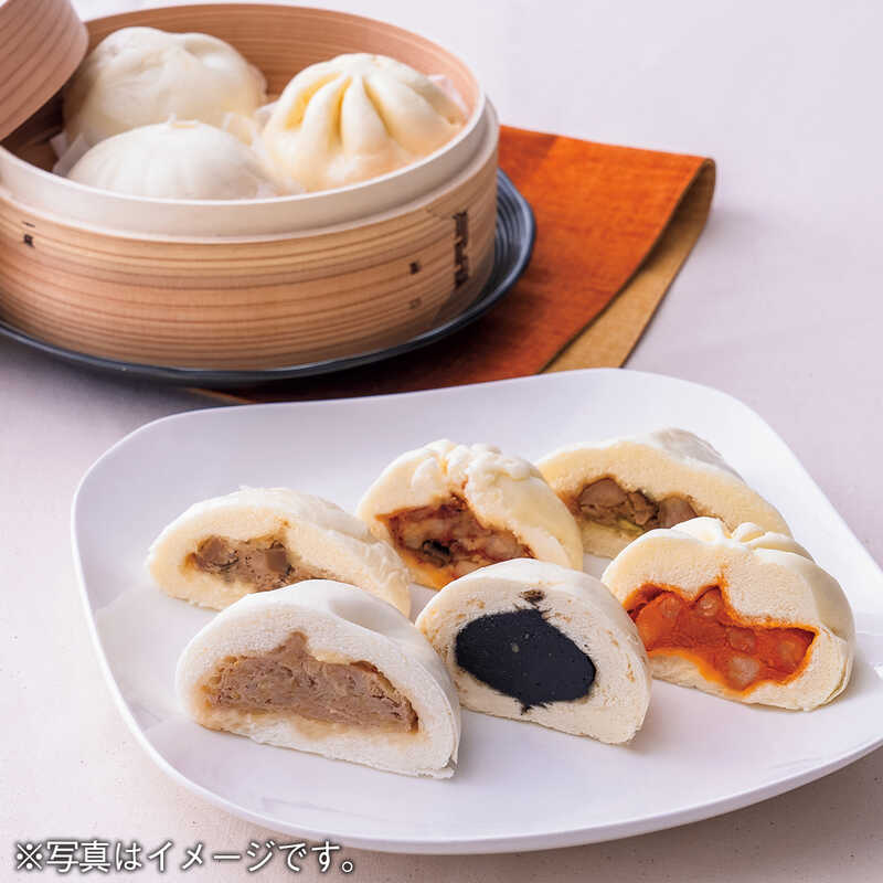 ブタまん120g×4、クルミ入り黒ゴマあんまん100g×4、フカヒレ豚まん100g×3、エビチリまん100g×3、豚角煮まん100g×3、チャーシュー包100g×3