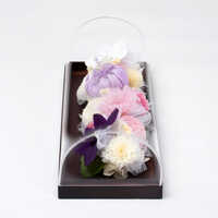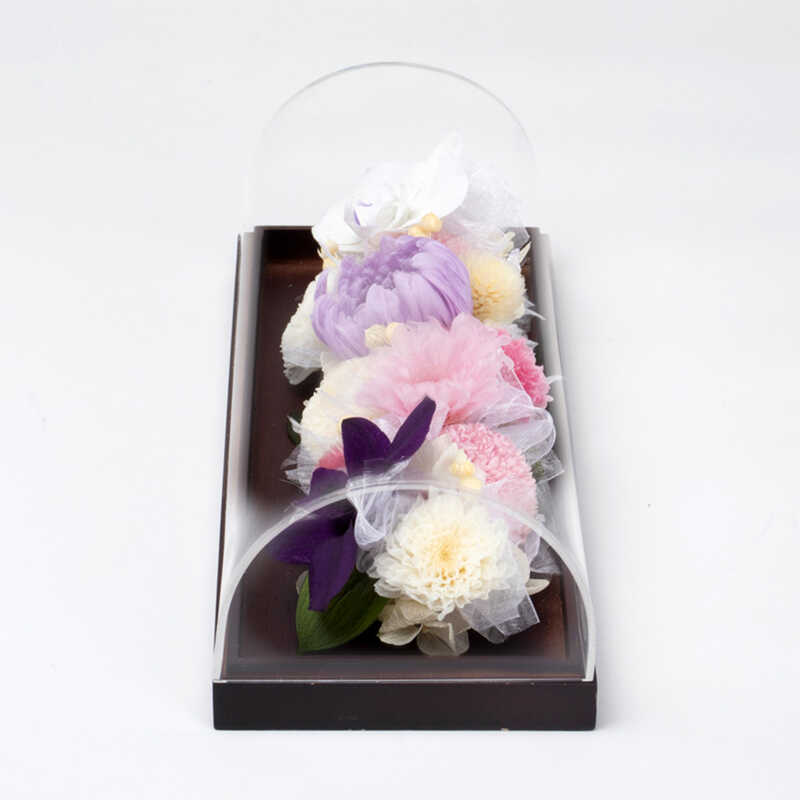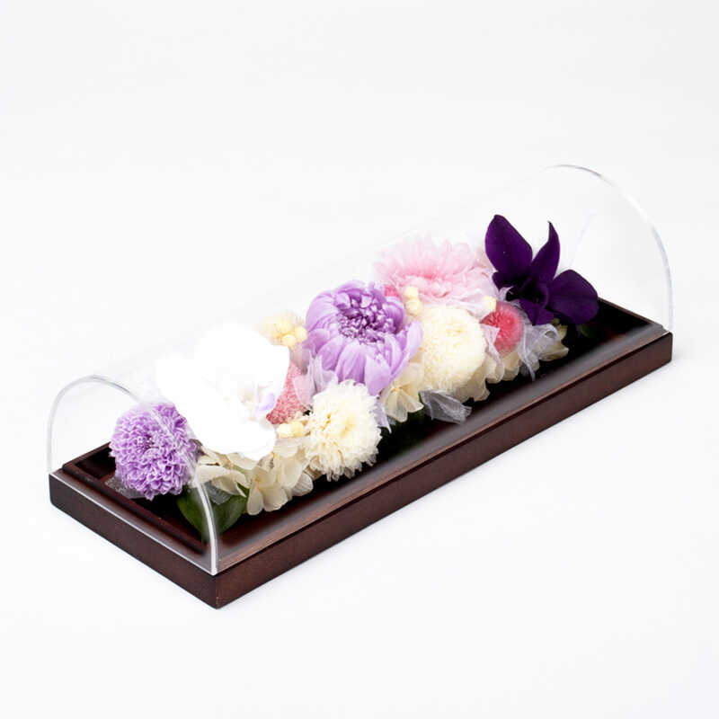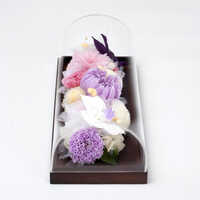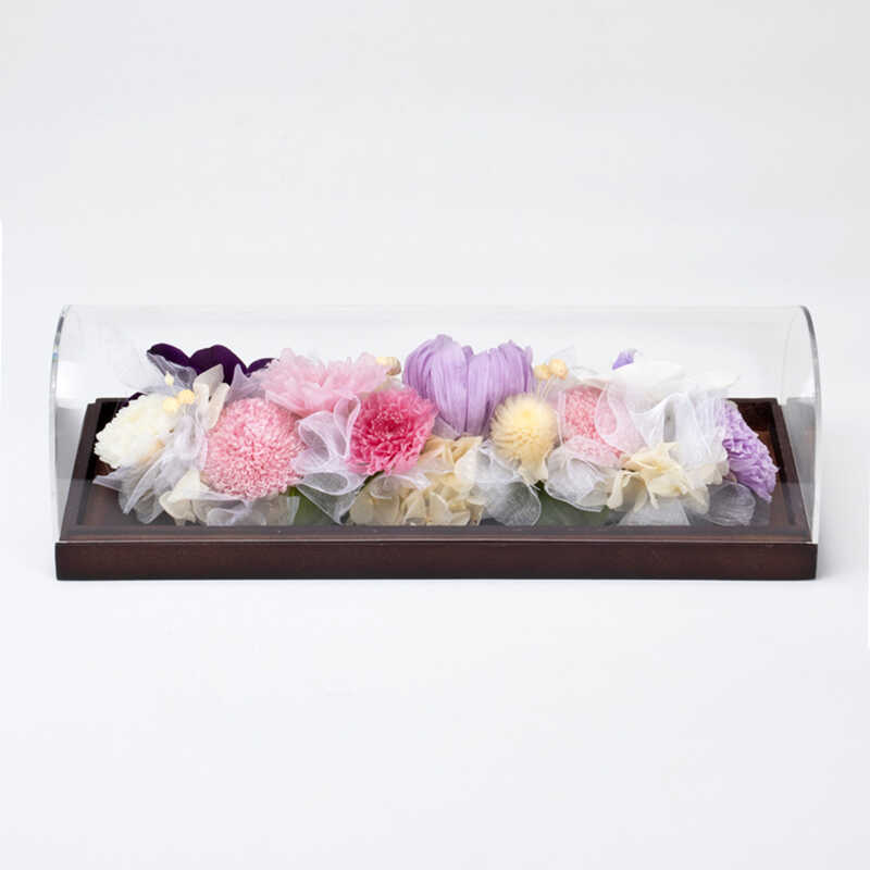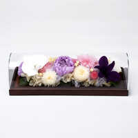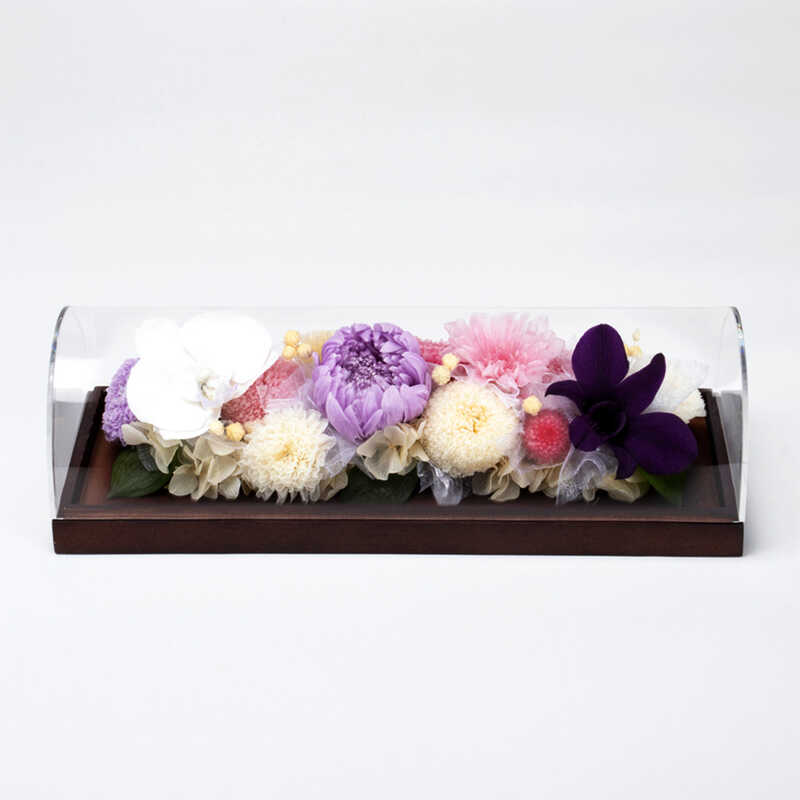 透明のアクリルカバーがかかったプリザーブドフラワーです。