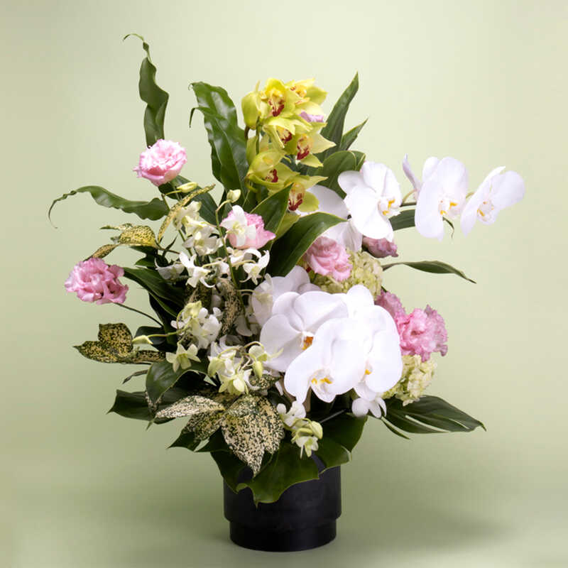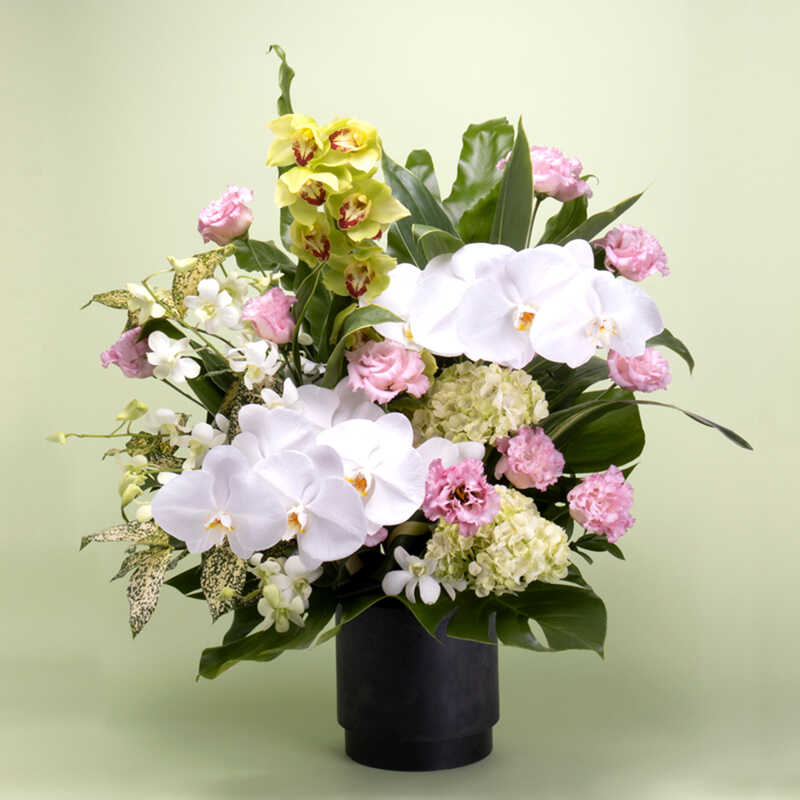 胡蝶蘭などの蘭が入った豪華な商品です。さみしくなり過ぎないよう上品な色合いに仕上げました。