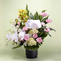 白・ピンク・グリーンが入ったお供えアレンジメントです。