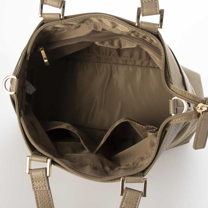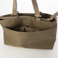 ちょっとしたお出かけやお買いものに便利な小ぶりサイズのトートバッグ。やわらかな光沢感が上品なナイロン素材とシュリンクシボのフェイクレザーのコンビが特徴的で、いつものコーデを格上げしてくれるアイテムです。長財布が余裕で収納できるサイズ感で、6つのポケットで持ち物を整理してご使用いただけます。ショルダーストラップは取り外しでき、シーンやスタイルに合わせて持ち方を変えられる2WAY仕様です。