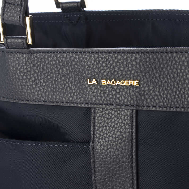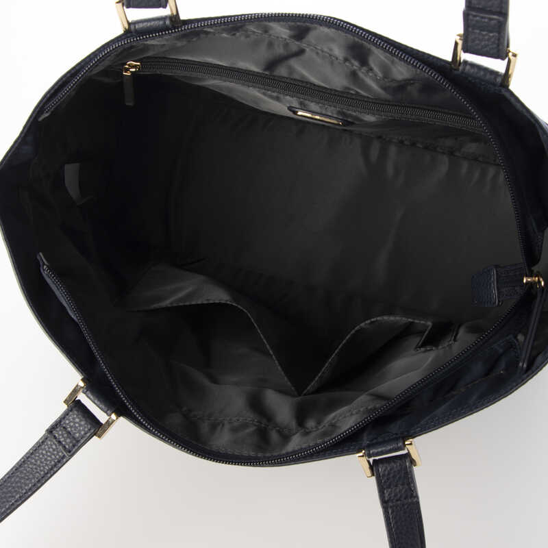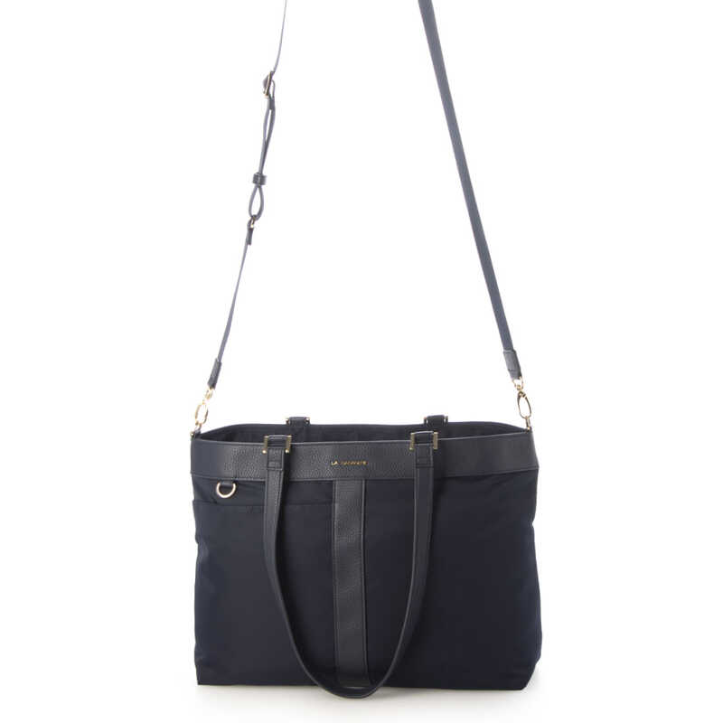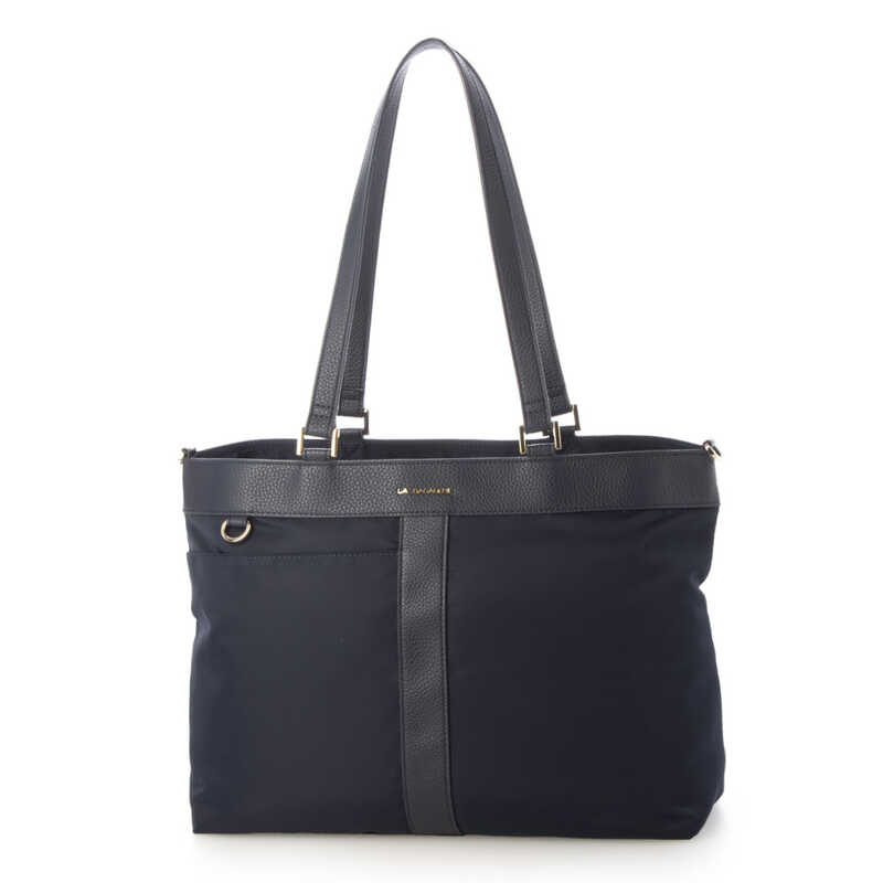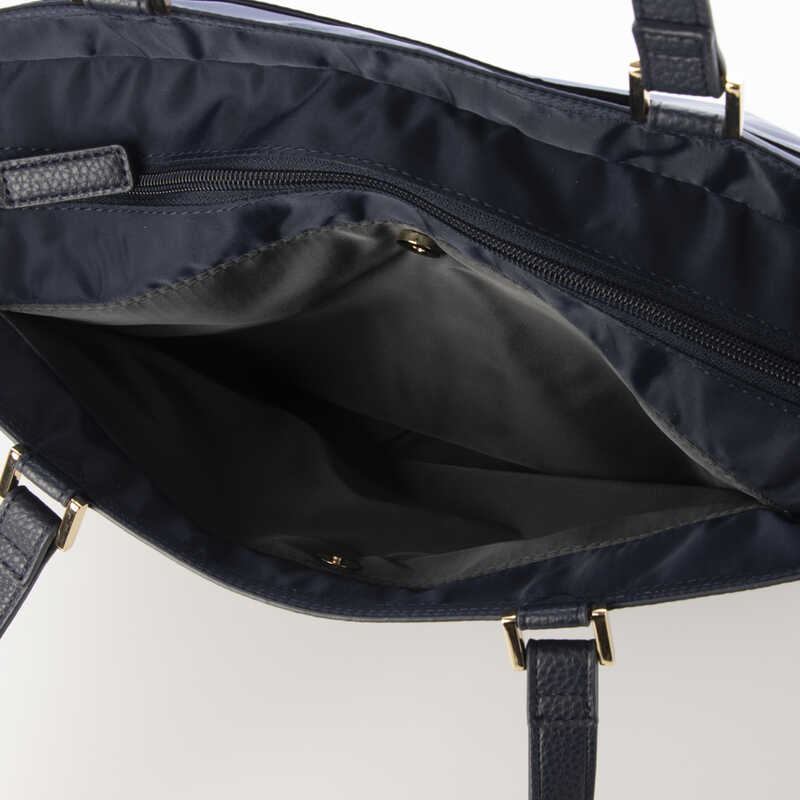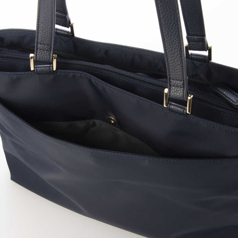 ちょっとしたお出かけやお買いものに便利な小ぶりサイズのトートバッグ。やわらかな光沢感が上品なナイロン素材とシュリンクシボのフェイクレザーのコンビが特徴的で、いつものコーデを格上げしてくれるアイテムです。6つのポケットで持ち物を整理してご使用いただけます。通勤や通学にも活躍する、A4サイズが収納可能なサイズです。ショルダーストラップは取り外しでき、シーンやスタイルに合わせて持ち方を変えられる2WAY仕様。