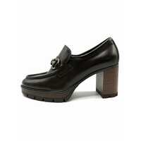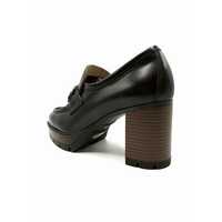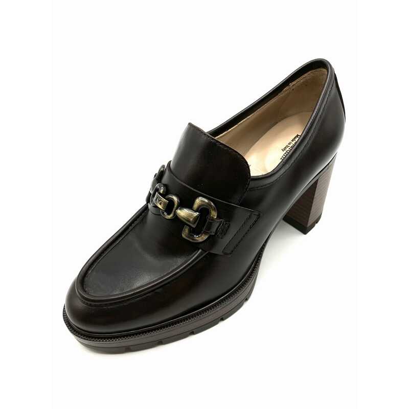 上質なイタリア素材を使ったヒールアップローファーです。甲部分のビット金具がアクセントになっています。ヒール高さ7.5cmのチャンキーヒールは安定感があり、脚長効果も期待できます。