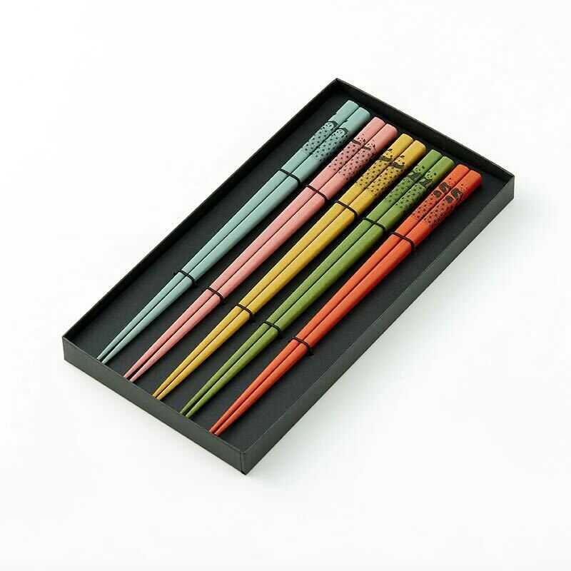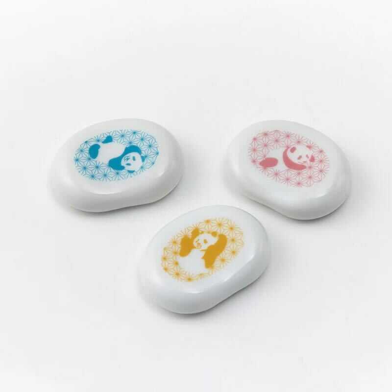 上野パンダファミリーモチーフの、子供の健やかな成長を願う麻の葉模様をあしらった箸のセット。5膳それぞれ違う色とデザインなので、ゲスト箸としても重宝します。天然の木材に「摺り漆」という技法を用いており、職人が1本1本漆をしみ込ませて丁寧に拭き上げることにより、汚れが付着しにくく強度も増し、より長くお使いいただけます。シンプルでおしゃれなそら豆型の箸置きに、あしらいました。「ハレ箸セット」と一緒にお使いいただける箸置きも、それぞれのパンダのカラーを合わせました。
