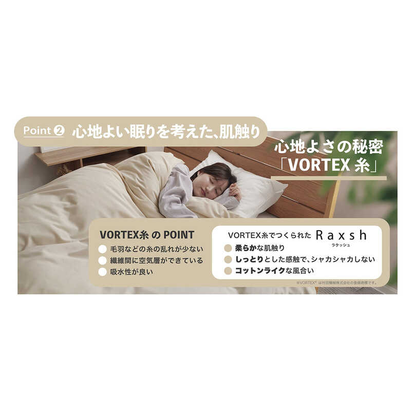 シワになりにくく、扱いやすいコットンライクな肌触りの掛けふとんカバーです。速乾性にも優れており、たたんだままの状態で省スペースでの乾燥も可能です。