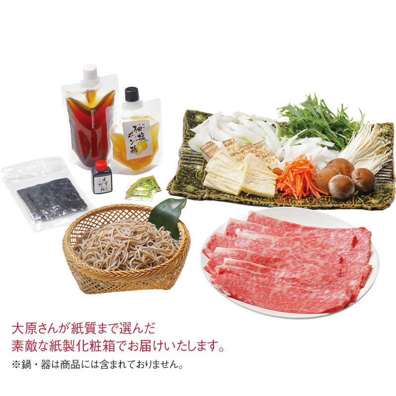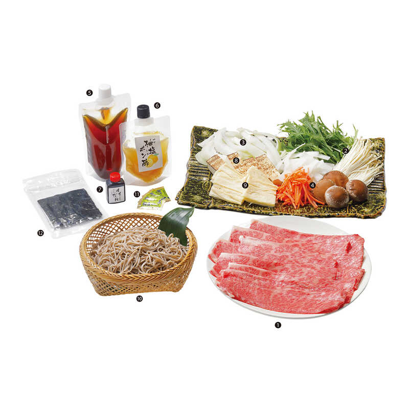 熊本和王 牛肩ロース肉500g、出汁しゃぶ用つゆ(4倍希釈)300g、玉ねぎ200g、茹でそば150g×4袋 ほか[お鍋のしおり付き]