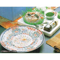とらふぐ刺身150g(33cm皿盛り付け)、とらふぐ鍋用あらぶつ切り500g、とらふぐ皮刺し100g、ポン酢150ml、紅葉卸10g×4、焼きひれ3g、刻み葱