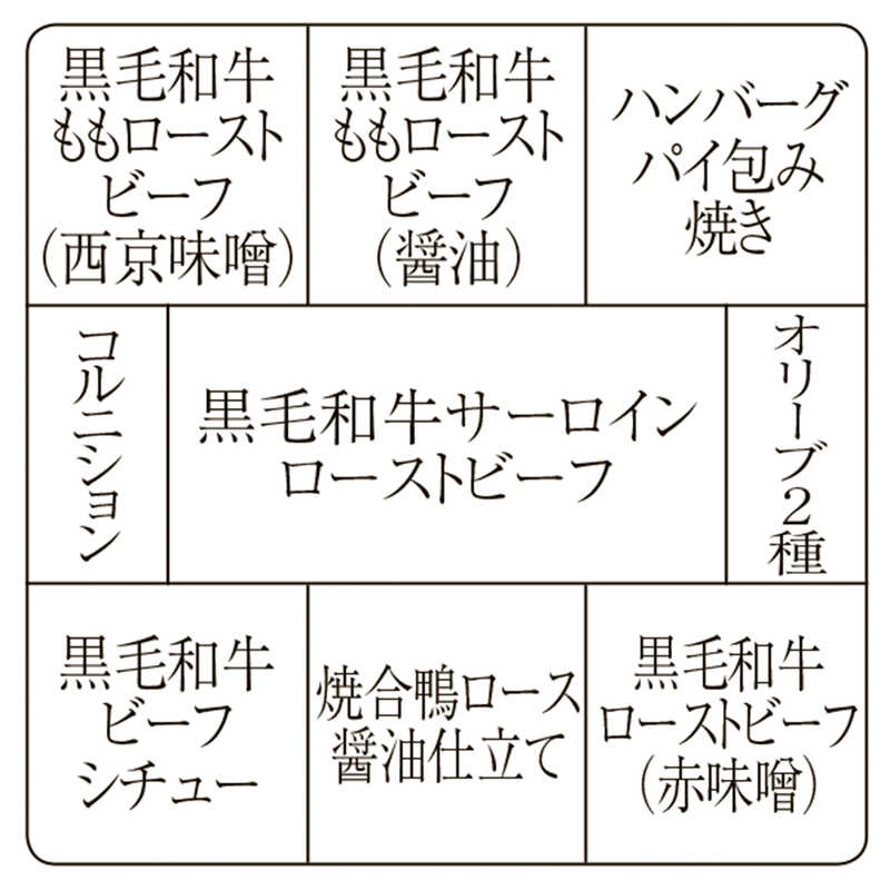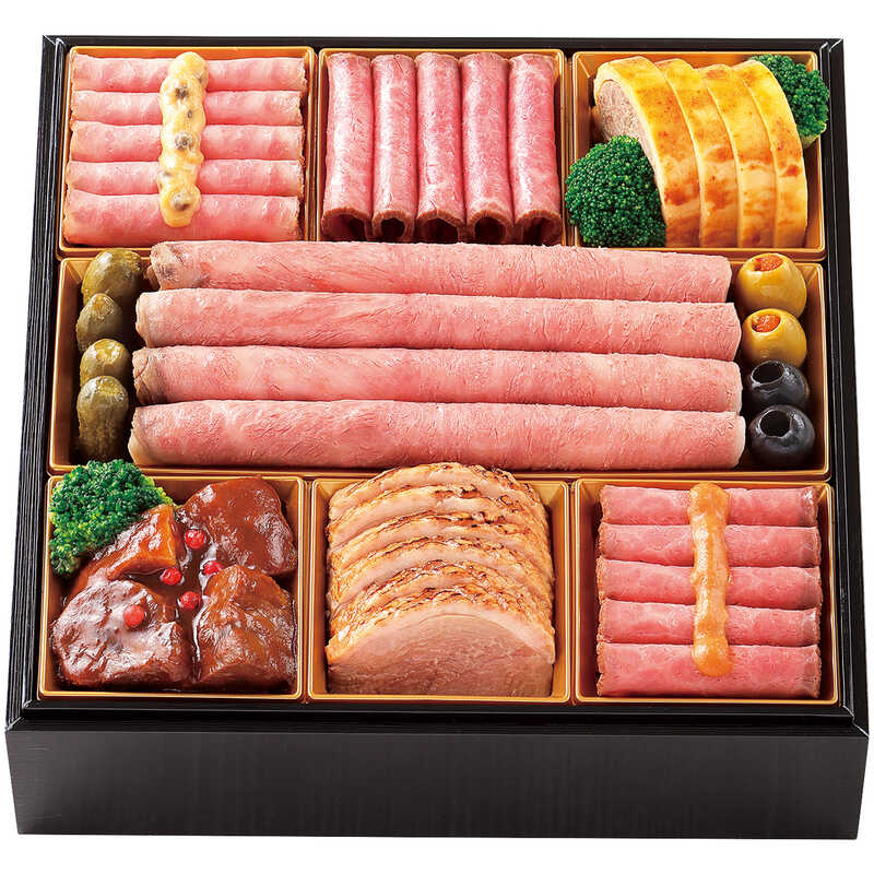 黒毛和牛のサーロインローストビーフやビーフシチューなど和食の匠とフレンチの名店が織りなす肉おせちの共演。