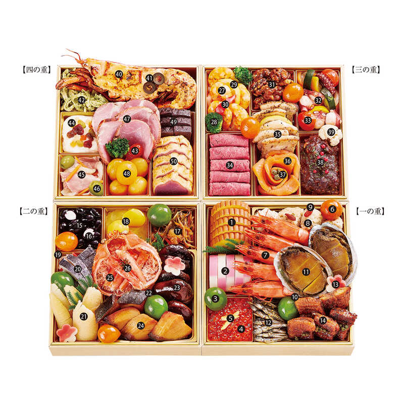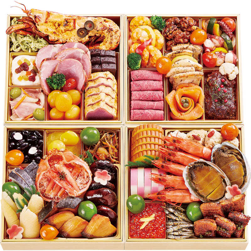 伝統の和のおせちに、オマール海老雲丹トマトグリルや牛肉の赤ワイン煮など、洋の味わいを添えた絢爛豪華なおせちです。