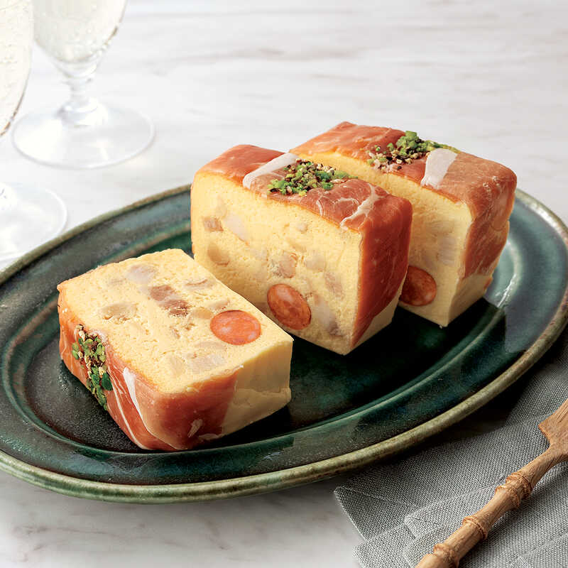 甘塩っぱく軽やか食感の新感覚おつまみチーズテリーヌ!泡系のお酒やドリンクと合わせてパーティーの前菜に。