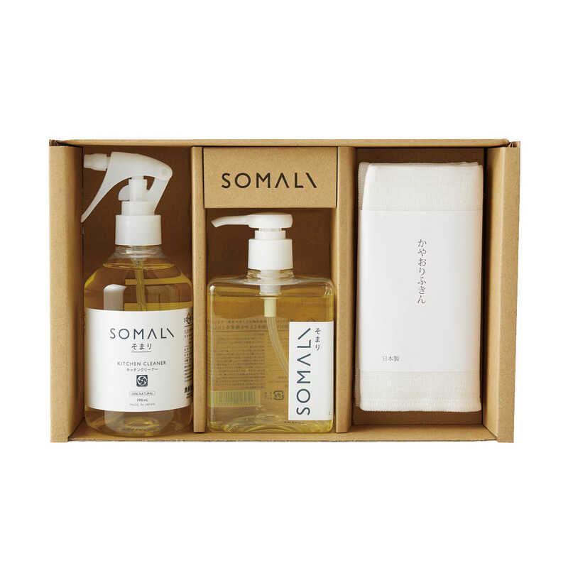 SOMALI台所用複合石けん・SOMALIキッチンクリーナー(各300ml)・かやおりふきん×各1