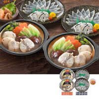 - とらふぐちり鍋(個食鍋)(300g)・とらふぐ刺身(17cm皿)(15g)・とらふぐ皮(20g)×各2、とらふぐ塩辛(60g)、ふくポン酢・もみじおろし(各10g)×各4