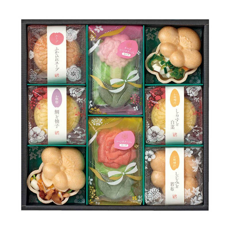 - スープ/ふかひれ・チーズコーンポタージュ・コーンポタージュ×各1、お吸物/鯛と柚子・貝柱ときのこ×各1、お味噌汁/豆腐とわかめ・しらすと白菜・しじみと若布×各1