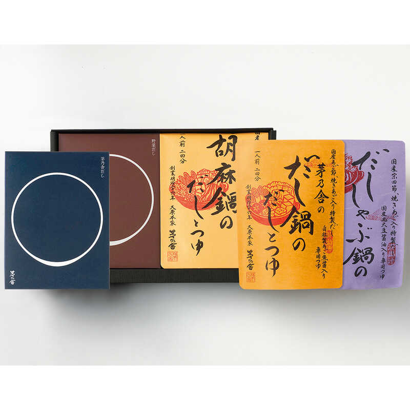 定番の茅乃舎だしと野菜だし、人気の鍋3種セット。
