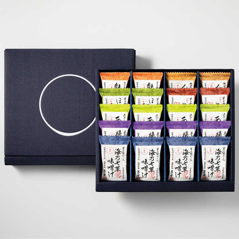 - 揚げ茄子の味噌汁・海乃七草味噌汁・あおさの味噌汁(各1食入)×各4個、麩とわかめの赤だし・きのこの味噌汁・ほうれん草と卵の味噌汁・なめこの味噌汁(各1食入)×各2個