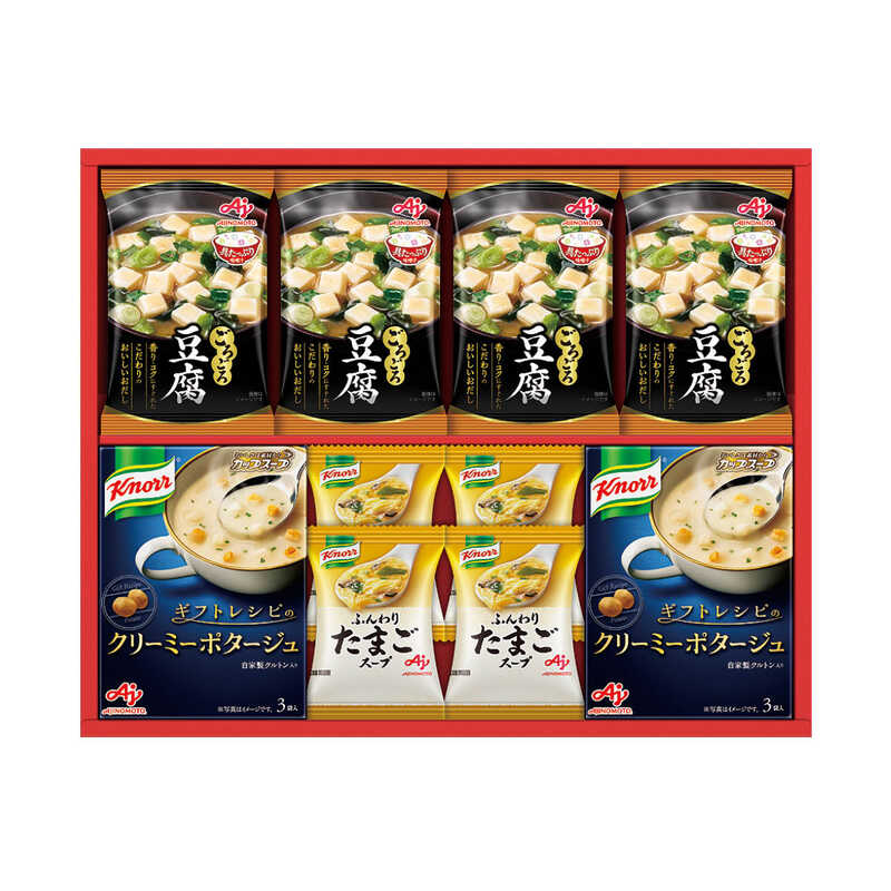 - 具たっぷり味噌汁/ごろごろ豆腐(1食入)×4(13.9g)、クノール/ふんわりたまごスープ(1食入)×4(6.5g)、カップスープ ギフトレシピのクリーミーポタージュ(3袋入)×2(49.8g)