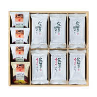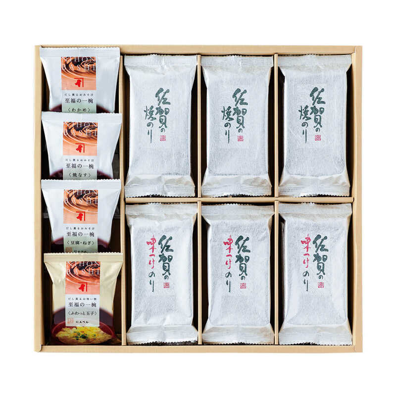 - 味付のり・焼のり(各8切4枚)×各6袋、わかめのお味噌汁×1、焼なすのお味噌汁×1、豆腐・ねぎのお味噌汁×1、ふわっと玉子のお吸物×1