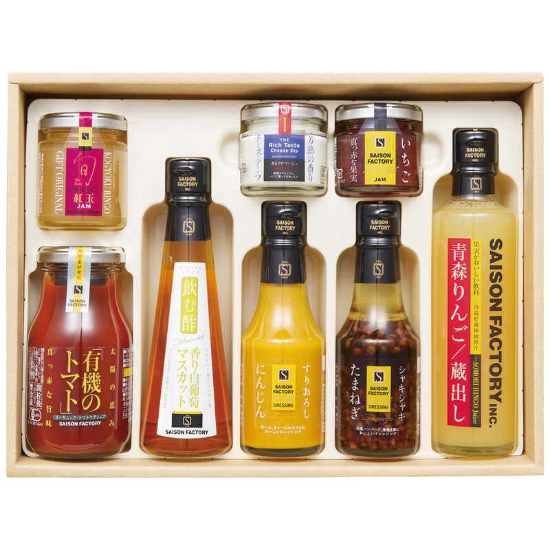 - りんごジャム(100g)・有機のトマトケチャップ(300g)・飲む酢マスカット(160mL)・チーズディップ(50g)・リッチスタイルジャムいちご(70g)・リッチスタイルドレッシング/にんじん・たまねぎ(各140mL)・りんごジュース(270g)×各1