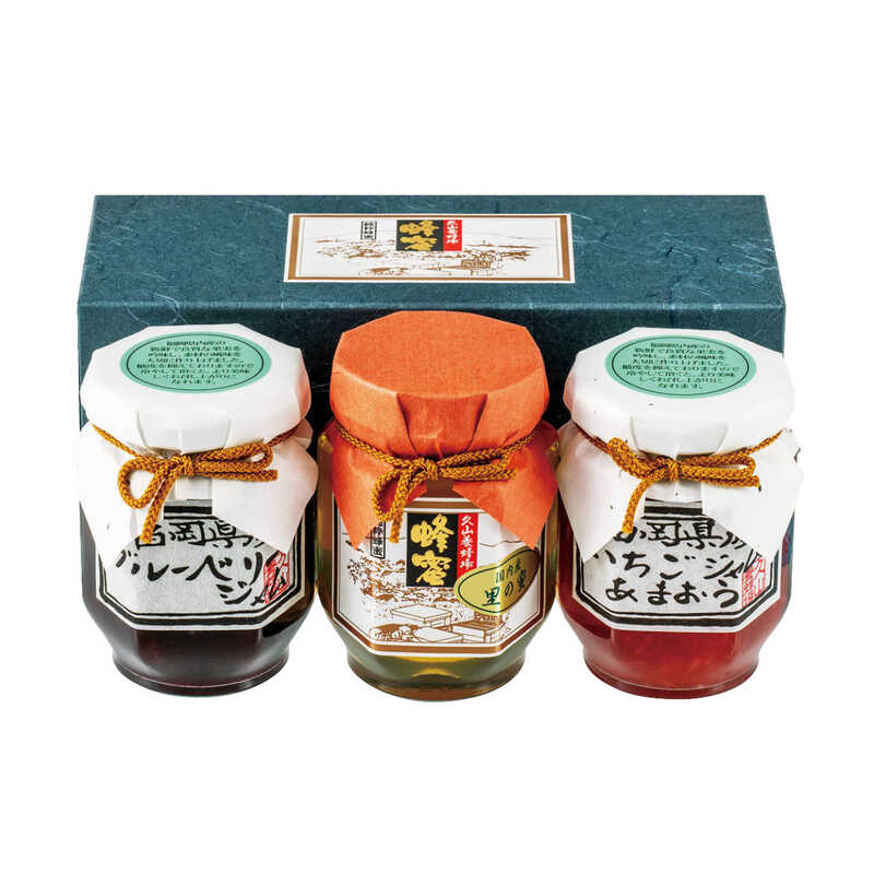 - 国内産蜂蜜(里の蜜)(170g)・いちごジャム・ブルーベリージャム(福岡県内産果実使用)(各140g)×各1