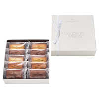 アーモンドプードルの風味豊かなナチュールと、ガトーショコラのような濃厚な味わいのショコラ、爽やかなオレンジ コンフィを散りばめたオランジュ、キャラメル風味の生地にオレンジ コンフィを合わせたオランジュキャラメルの4種類のフィナンシェの詰合せ。