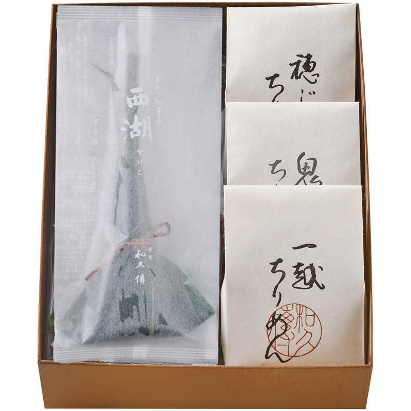 料亭の仕立てる菓子「西湖」と、口当たりや風味の違いをお楽しみいただけるちりめん3種を詰め合わせました。