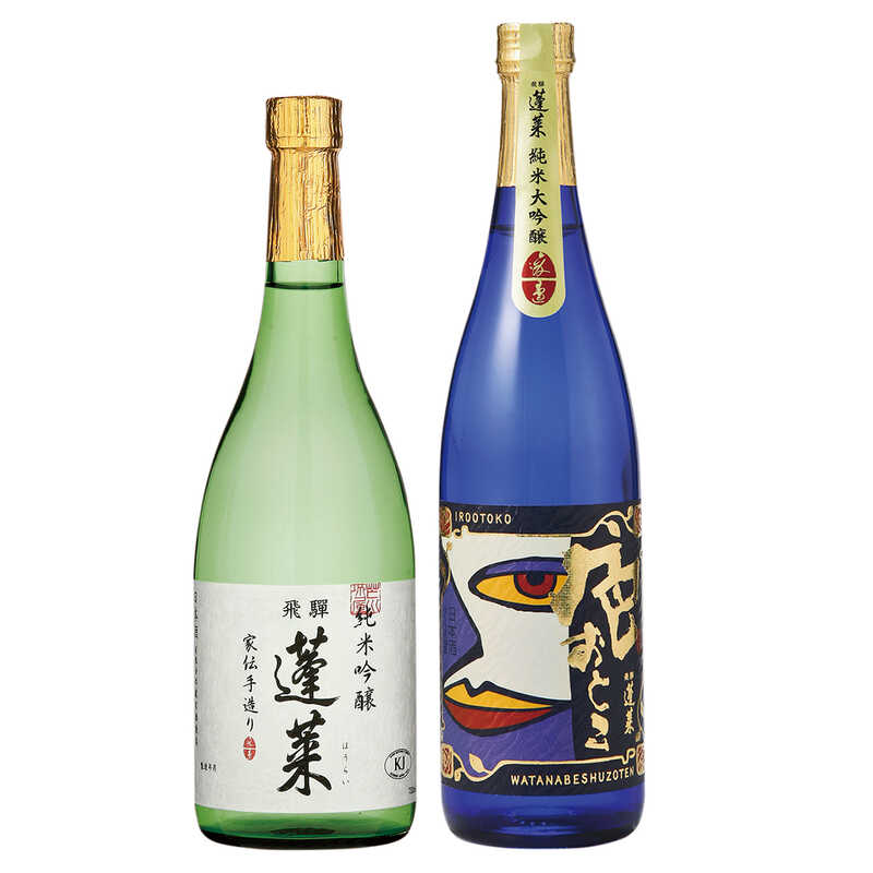 ANA国際線ファーストクラスで採用された蓬莱の看板酒「純米吟醸家伝手造り」、インパクトのあるラベルとフルーティーでみずみずしい味わいが人気の「純米大吟醸色おとこ」詰め合わせ。