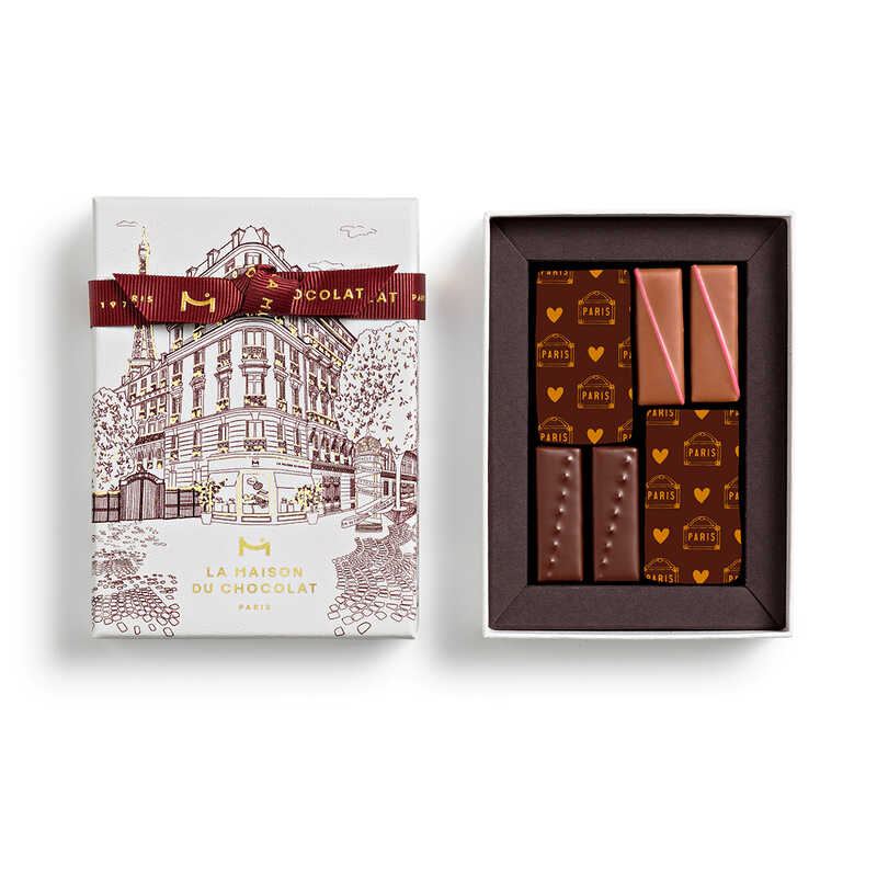 コレクション限定デザインでドレスアップしたギフトボックスに、3種の限定レシピを6粒収めた詰合せ。この「オ クール デュ フォブール」コレクションを通して、フランスらしいシックでエレガントな魅力を表現しています。