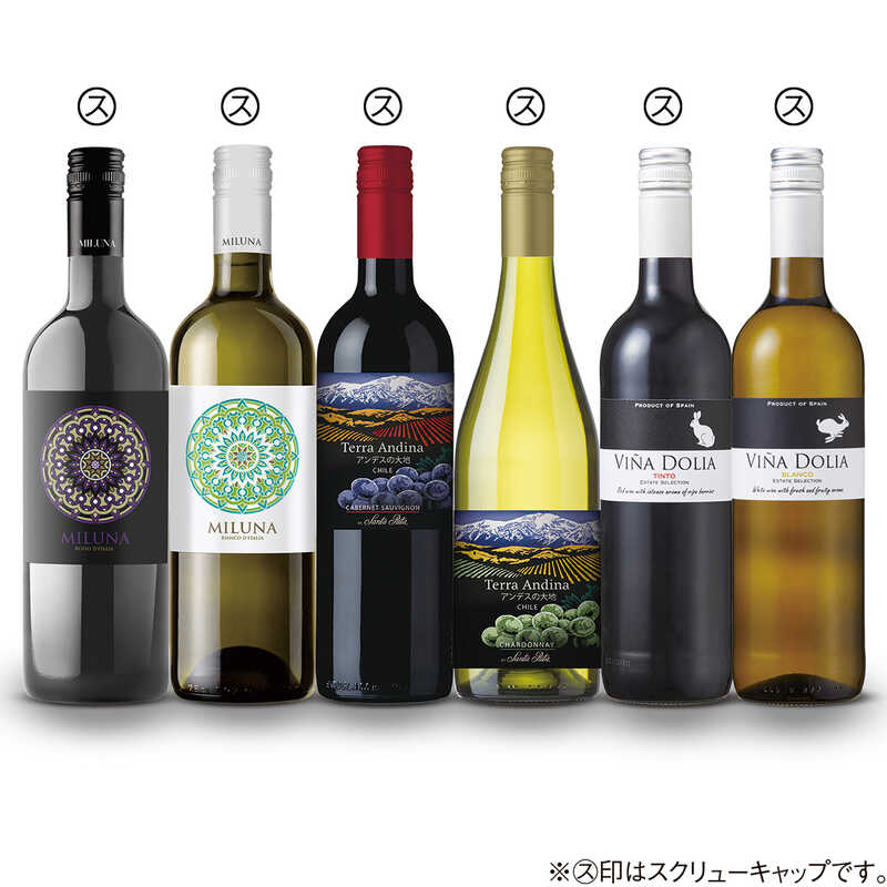 - ミルーナ/赤(ミディアムボディ)・白(辛口)(各イタリア)・テラ アンディーナ/赤(ミディアムボディ)・白(辛口)(各チリ)・ヴィニャ ドリア/赤(ミディアムボディ)・白(辛口)(各スペイン)×各1(各750mL)